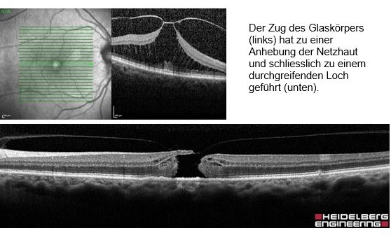 Ein durchgreifendes Makulaloch kommt durch Zug des Glaskörpers auf die Makula zustande. Indem der Glaskörper sich nicht von der Makula löst, kann er so fest am Gewebe ziehen, dass dieses angehoben und schliesslich sogar aufgerissen wird. Dabei fehlt jedoch kein Stück Netzhaut, sondern die Makula ist im Grunde nur durch die Anhebung des Gewebes auseinandergewichen. In den späten Stadien können sich die angehobenen Lochränder voneinander entfernen. Diese Erkrankung schreitet relativ rasch fort und die Patienten bemerken einen akuten Abfall der Sehschärfe. Eine spontane Heilung wird manchmal in frühen Stadien beobachtet.