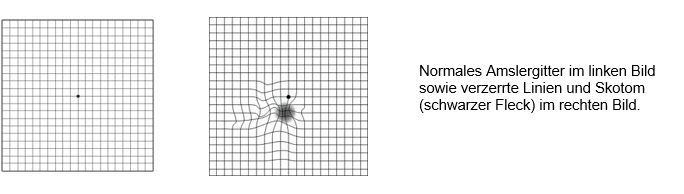Veränderungen an der Makula führen typischerweise zu Beschwerden beim Lesen, da die Makula als Stelle des schärfsten Sehens für diese Aufgabe sehr wichtig ist. Die Verformung der Makula äussert sich beim Sehen in einer Verzerrung von geraden Linien. Diese erscheinen gebogen und verformt. Bei einer grösseren Schädigung der Makula (wie beispielsweise einem durchgreifenden Makulaforamen) besteht in der Mitte ein schwarzer Fleck (ein sogenanntes Skotom). Manchmal beschreiben die Patienten auch nur ein Verschwommensehen am betroffenen Auge. Wird mit dem Amsler-Gitter untersucht zeigen sich hierbei oft Veränderungen.